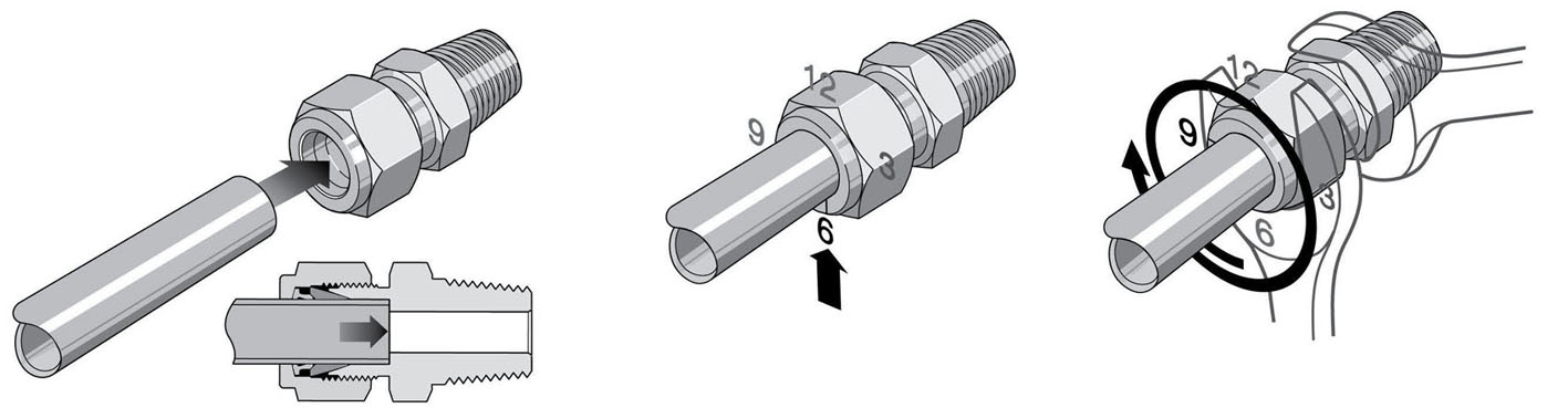 3、 對于Φ1/16、Φ1/8、Φ3/16、Φ2、Φ3、Φ4mm的卡套式管接頭,僅將螺母緊固四分之三圈,使其停在3點鐘方向的位置。
